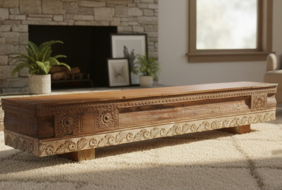 The facade of this bench is a masterpiece of artisan storytelling, featuring a multi-layered frieze of majestic hand-carvings. The upper border boasts intricate geometric patterns and circular floral medallions, while the lower base is defined by a lush, continuous relief of foliate scrolls and blooming rosettes finished with a delicate whitewash patina. Resting on low-profile, sturdy block feet, this reclaimed wood style bench serves as a stunning focal point for a grand entryway, at the foot of a luxury bed, or as an architectural display plinth in a high-end gallery.