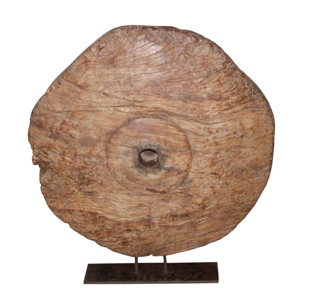 The sculpture is defined by its majestic irregular circular form, echoing the shape of a sun-bleached celestial body or an ancient millstone. At its center, a square iron mount provides a subtle industrial contrast to the organic warmth of the reclaimed wood. Elevated on a minimalist matte-black iron pedestal with a low-profile rectangular base, this artisan artifact brings a sense of elemental history and high-end textural intrigue to any luxury console, mantel, or gallery pedestal.