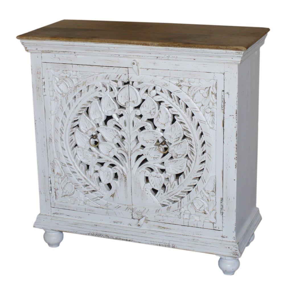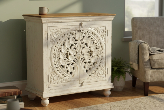 Behold the beauty of this Reclaimed Wood Cabinet, a true statement of royal artistry. Finished in a soft white paint, its two doors feature a deeply hand-carved circular design of the Tree of Life, instantly making it a magnificent focal point.