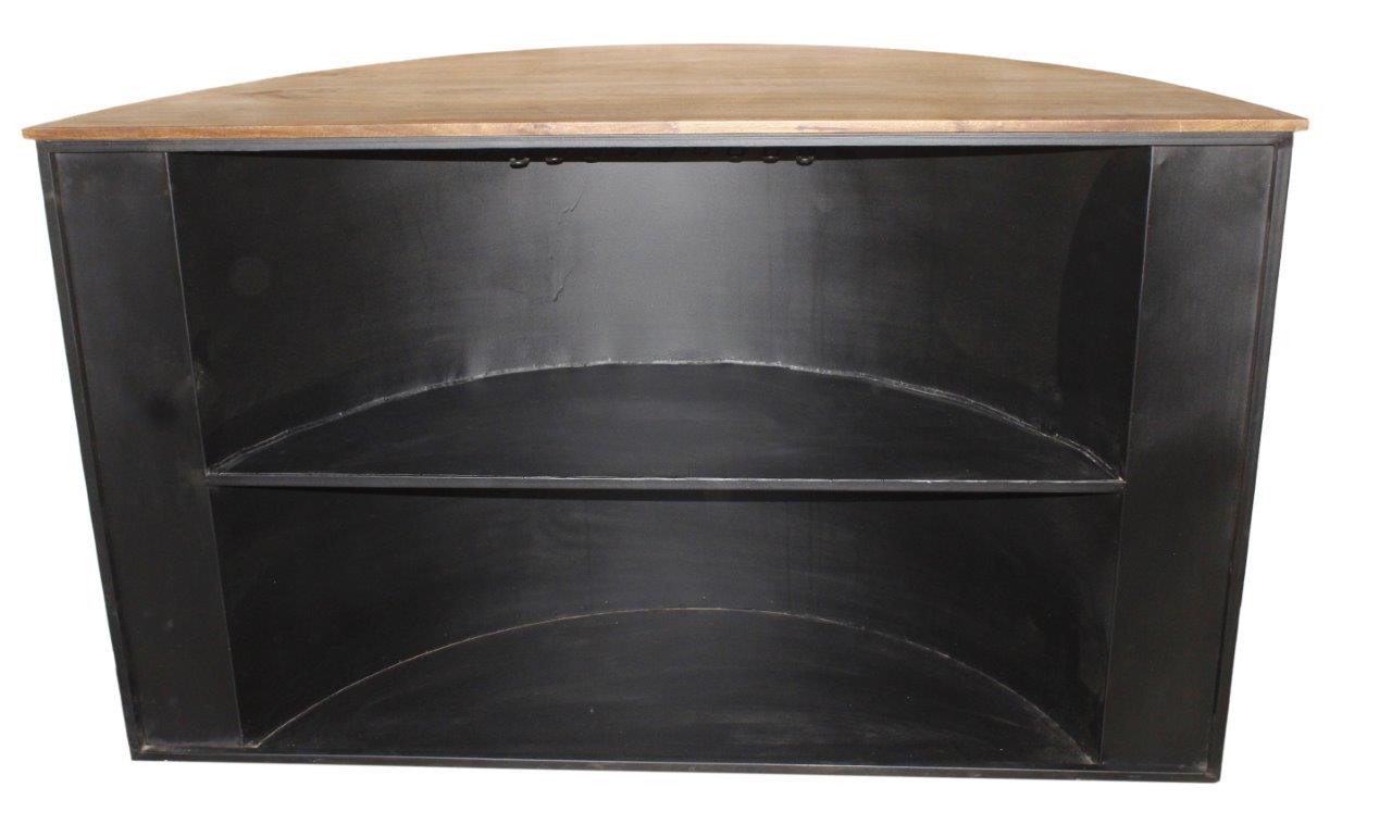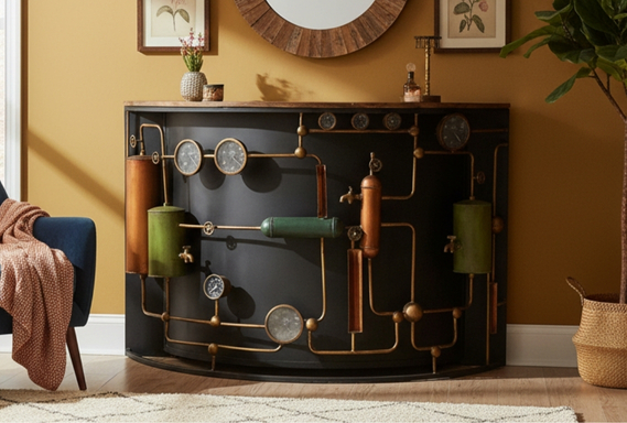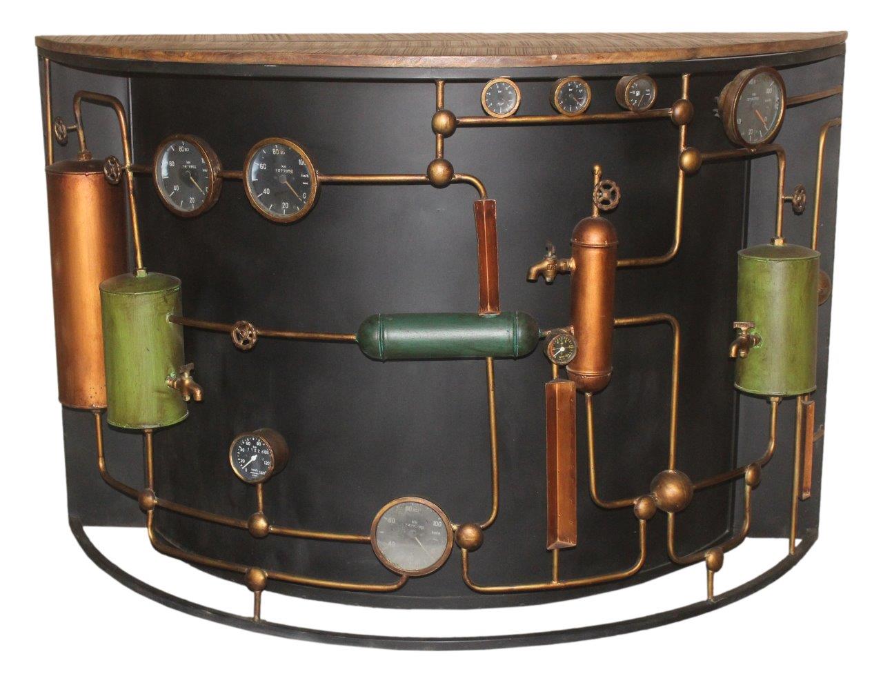 Step into the industrial past with this incredible bar/counter, featuring a bold, retro distillery-style design. The half-moon body is adorned with intricate metalwork, pressure gauges, pipes, and tanks, creating a stunning, Steampunk-inspired look. Capped with a rustic reclaimed wood top, this piece perfectly marries gritty industrial charm with natural elegance, making it an unforgettable statement for any entertaining space.