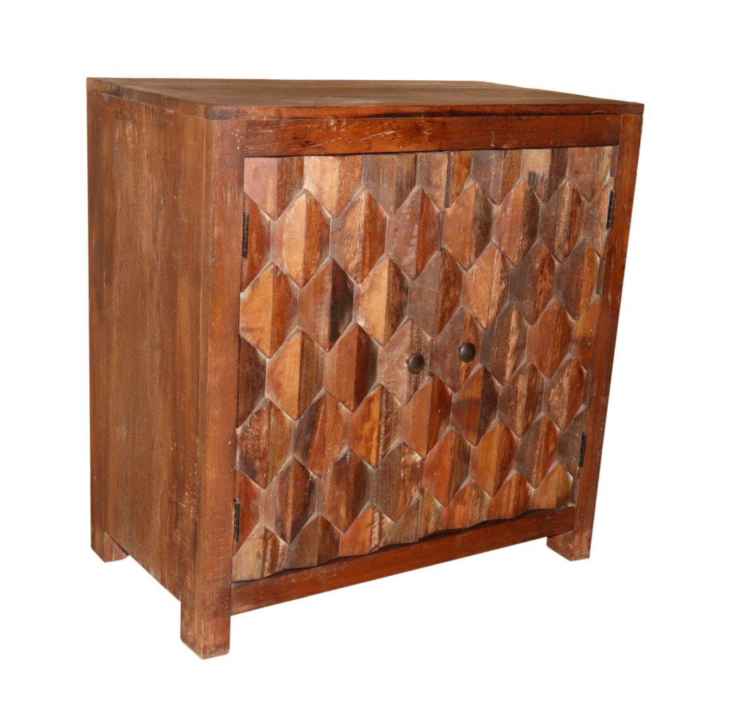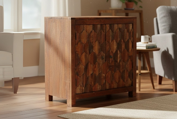 The standout feature of this solid wood piece is the extraordinary 3D geometric relief on its double doors. Each door is composed of meticulously carved diamond facets that create a captivating play of light and shadow, transforming a functional cabinet into a majestic work of artisan sculpture. Finished with minimalist circular metal pulls and supported by clean-lined squared legs, this cabinet offers substantial internal storage while serving as a sophisticated focal point for modern, rustic, or global-inspired interiors.