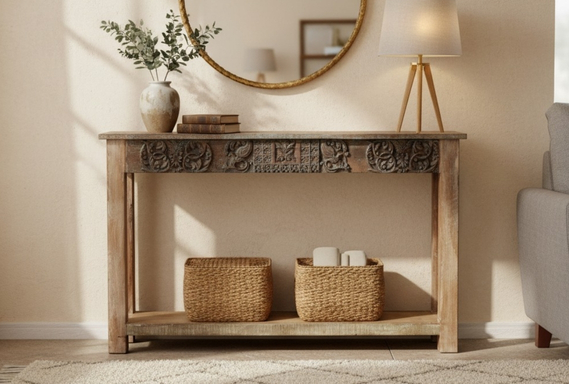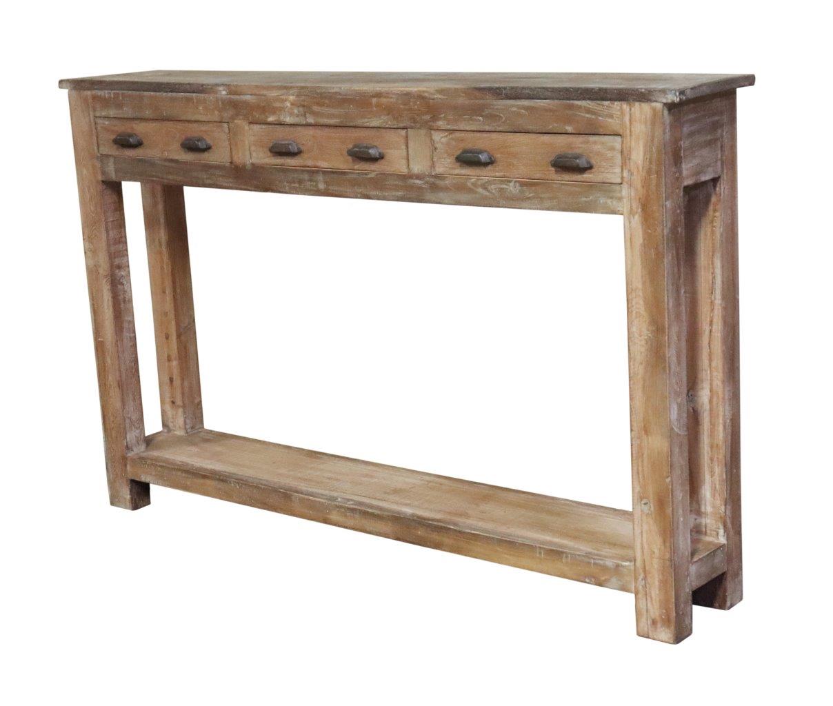Infuse your entryway with a sense of understated luxury with the Royal Heritage 3-Drawer Solid Wood Console. This premium hall table is meticulously handcrafted from solid wood, featuring a sophisticated weathered whitewash finish that celebrates the natural grain and aged textures of the timber.