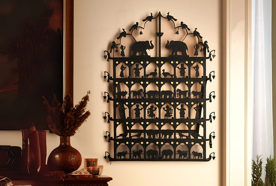 Transform your home into a palace of light with this magnificent Royal Metal Wall Tealight Holder. This premium statement piece features a grand arched silhouette filled with intricate metal silhouettes of majestic elephants, graceful peacocks, and traditional figures.
