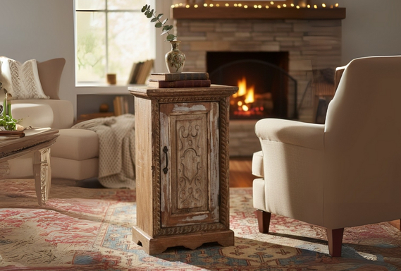 Add a touch of storied elegance to your home with the Scroll-Carved Solid Wood Accent Cabinet. This premium storage piece is handcrafted from solid wood, featuring a sophisticated weathered finish with subtle whitewash distressing that highlights the authentic aged character of the timber.