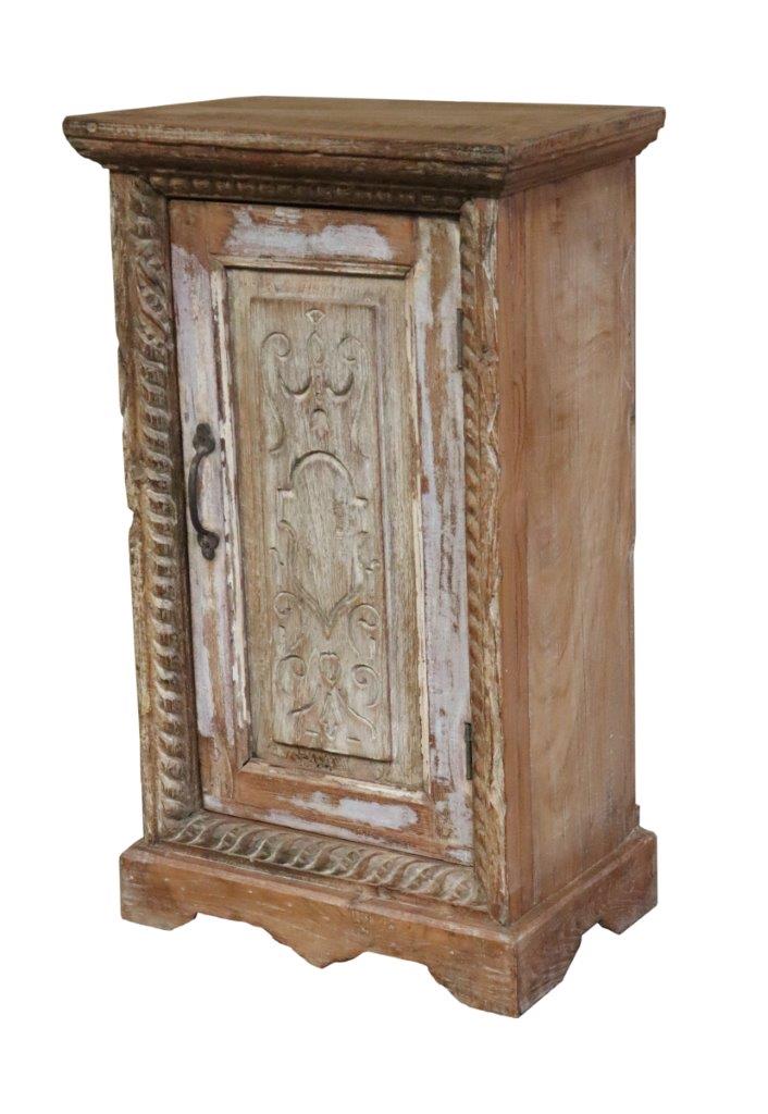 The cabinet is defined by its majestic hand-carved details, most notably the graceful scrollwork and floral-inspired relief on the single door panel. The door is framed by unique artisan twisted-rope pillars and crowned with a tiered mitered top. Secured by a traditional iron pull and resting on a sturdy scalloped plinth base, this reclaimed wood style cabinet offers a versatile storage solution for a luxury bedroom, a narrow hallway, or as a statement side table.