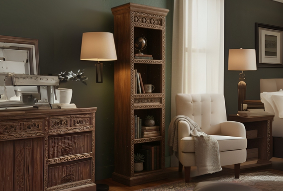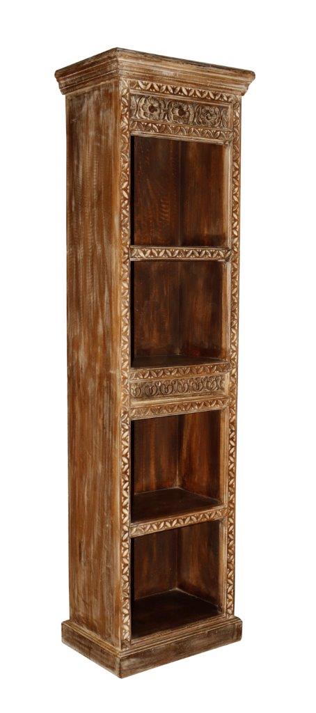 Elevate your vertical storage with the Solid Wood Artisan Carved Pillar Bookshelf. This premium tower is masterfully handcrafted from solid wood, featuring a rich, multi-tonal chestnut finish with a weathered whitewash patina that brings out the natural depth of the timber.