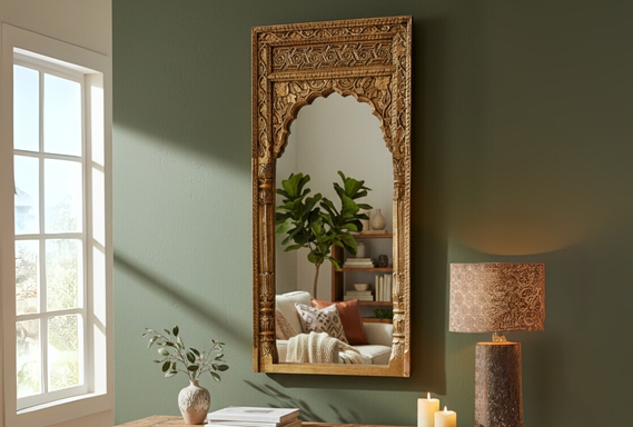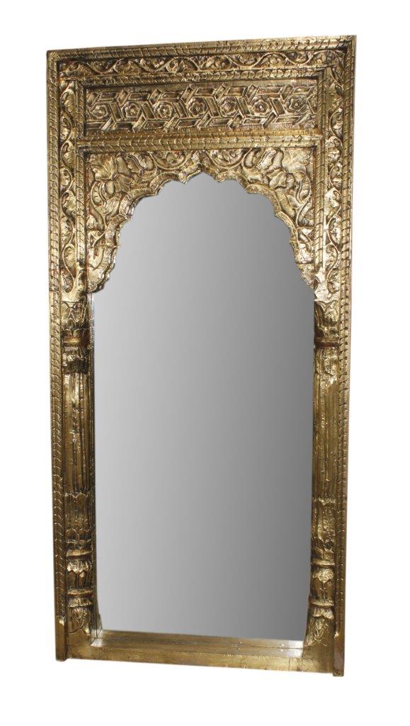 Adorn your wall with the magnificent grandeur of this Solid Wood Mirror. Its robust frame is deeply carved with intricate patterns and finished in a rich, opulent brass tone, giving it an undeniable royal look.