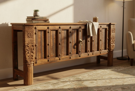 The facade is a work of artisan excellence, composed of vertical reclaimed wood panels reinforced with traditional iron straps and decorative floral studs. A central, heavy-duty iron ring pull serves as a majestic focal point on the textured front. The structure is anchored by two massive, hand-carved corner pillars featuring intricate floral reliefs and deep vertical fluting, providing an architectural presence that commands any room. With its expansive top and open-back gallery design, this solid wood console is the ultimate anchor for a grand foyer or a luxury living suite.