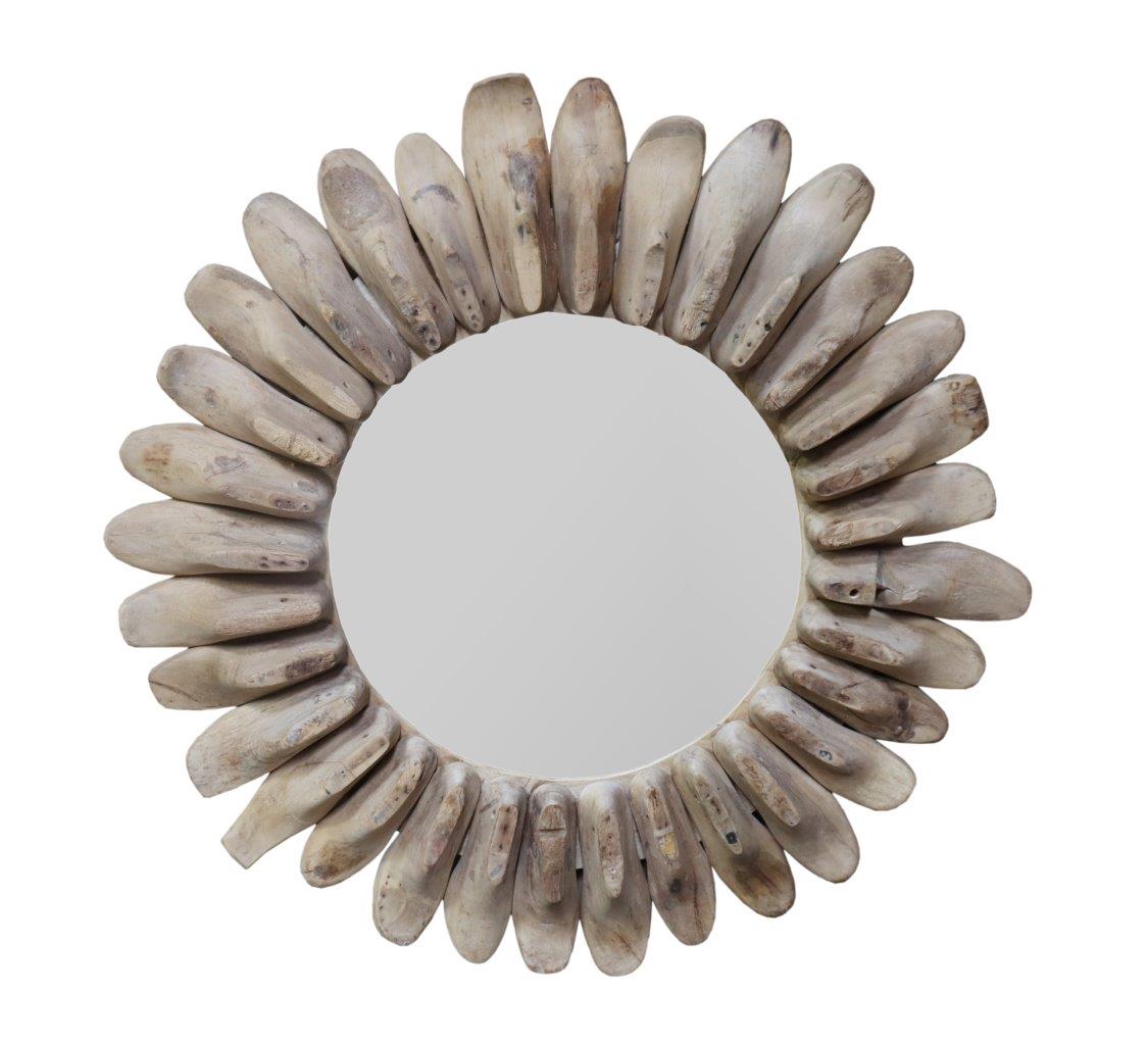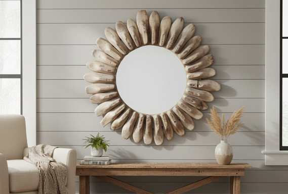 Each piece of reclaimed wood is finished in a soft, sun-bleached wash that emphasizes the natural knots and grain, creating a majestic weathered texture reminiscent of coastal driftwood. The radial arrangement creates a striking sense of movement, making this artisan mirror a perfect focal point for a living room, grand entryway, or master suite.