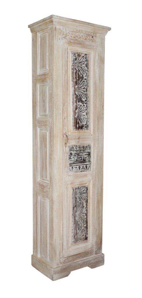The defining feature of this armoire is its tall, slender door, which showcases three vertical panels of intricate hand-carved relief work. These carvings feature traditional floral scrolls and geometric "Greek key" motifs, all rendered in the same weathered wood for a subtle, sophisticated texture. With its recessed side panelling and sturdy crown molding, this royal armoire is an ideal luxury solution for organizing linens or garments in narrow spaces.