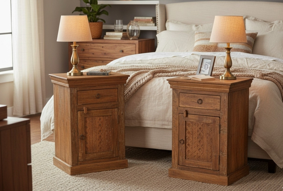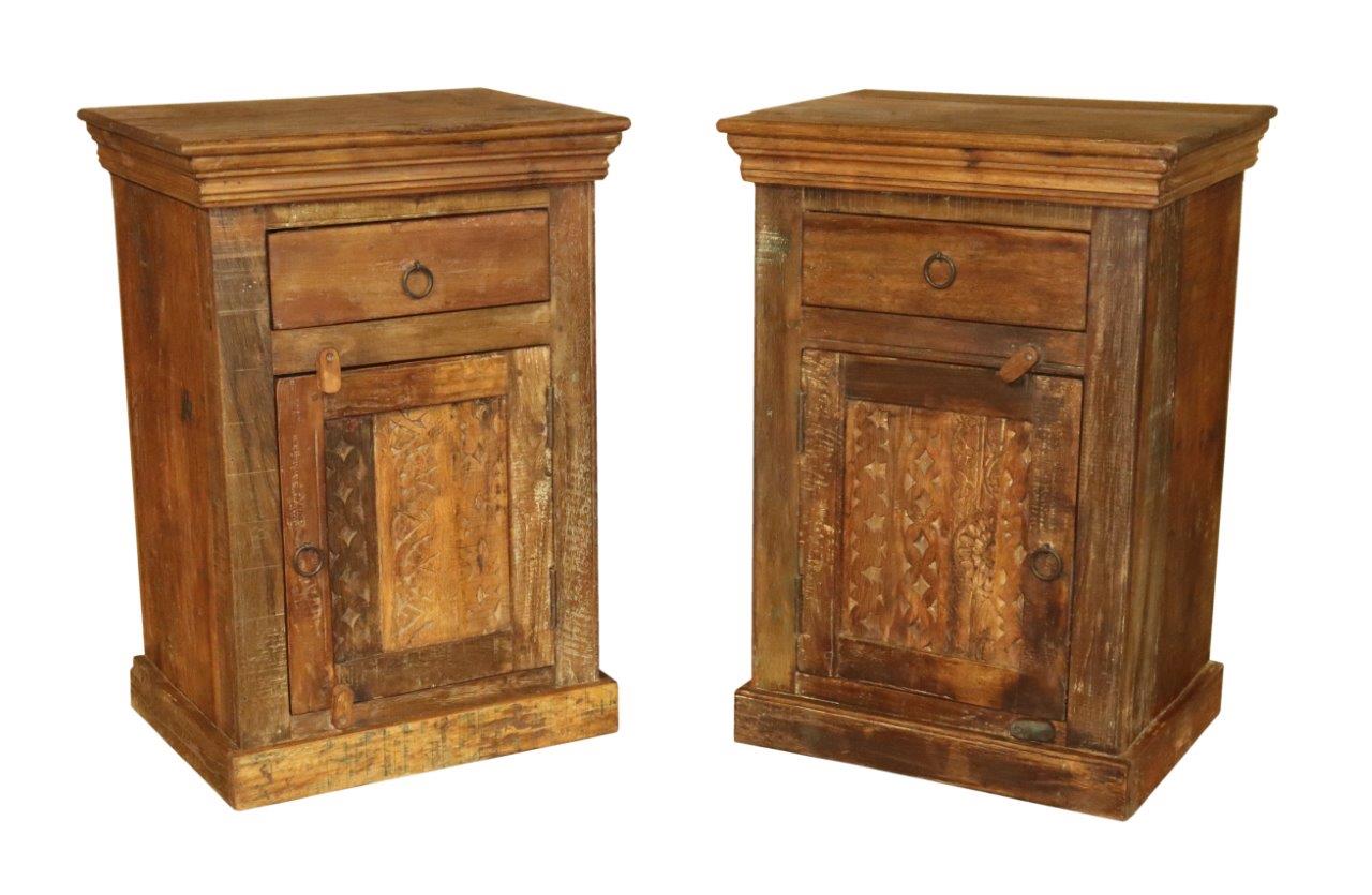 The cabinet is thoughtfully designed with a single smooth-gliding top drawer for essentials and a lower storage cupboard. The cupboard doors are the true artisan centerpiece, showcasing a majestic hand-carved geometric lattice and floral medallion relief. Complete with traditional mitered crown molding and a sturdy plinth base, these reclaimed wood style nightstands bring a sense of historical warmth and high-end craftsmanship to any luxury bedroom suite.