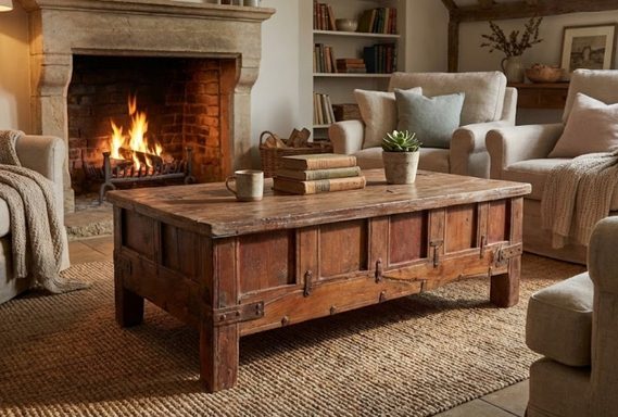 Command your living space with the rugged architectural presence of the Solid Wood Iron-Bound Coffee Table. This premium center piece is masterfully handcrafted from substantial solid wood, featuring a warm, honey-toned finish that highlights the authentic weathered grain and historical texture of the timber.