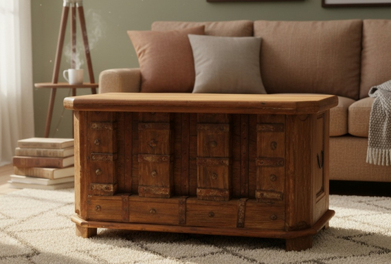 The facade of this chest is truly majestic, designed with vertical solid wood pillars reinforced by heavy-duty iron banding and hand-applied metal studs. The architectural recessed paneling creates deep shadows and visual interest, while the substantial mitered top and base provide a sense of grounded permanence. Equipped with traditional hand-forged iron ring handles on the sides, this reclaimed wood style trunk offers generous storage for blankets or heirlooms while doubling as a rugged, artisan coffee table in any luxury interior.