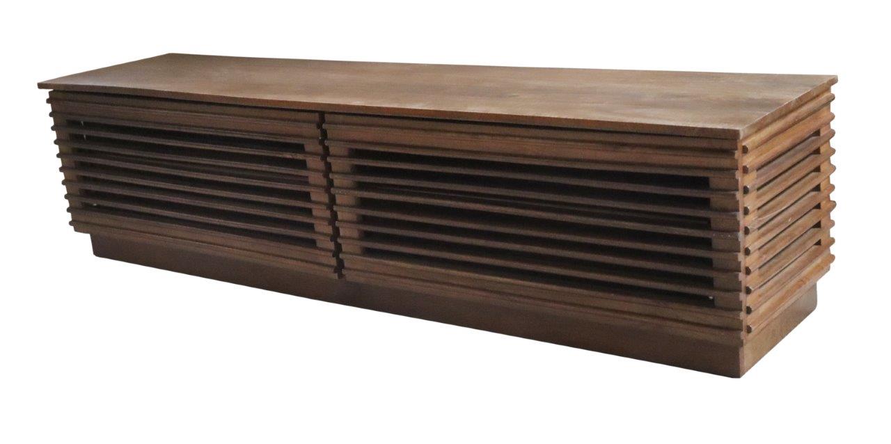 The design is truly majestic, defined by an intricate facade of horizontal artisan slats that create a sophisticated, louvre-style aesthetic. These linear elements provide a modern, tiered texture while maintaining a seamless and clean silhouette. Resting on a subtle, recessed solid wood plinth base, this versatile buffet serves as a high-end media console or a contemporary dining room centerpiece for luxury urban homes.
