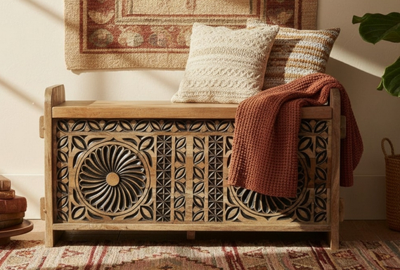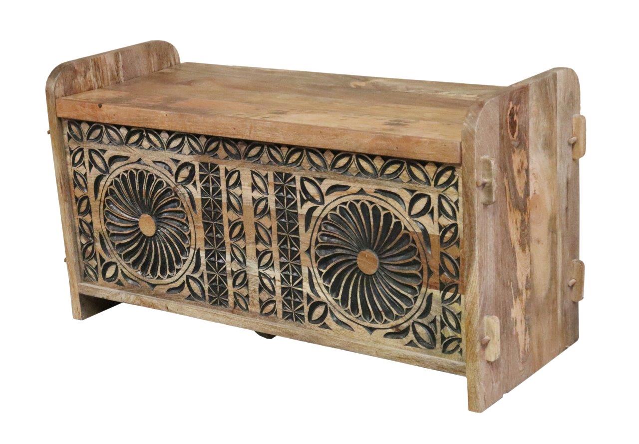 Enhance your home with the intricate craftsmanship of the Solid Wood Sun-Medallion Storage Bench. This premium accent piece is expertly handcrafted from solid wood, featuring a light, natural finish that emphasizes the organic grain and varied character of the timber.