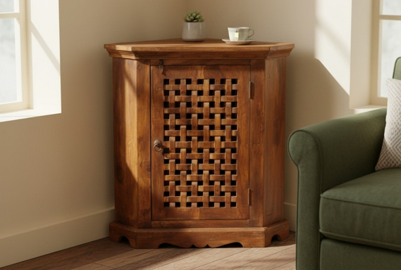 Maximize your floor plan with the timeless architectural charm of the Solid Wood Woven-Grate Corner Cabinet. This premium accent piece is masterfully handcrafted from substantial solid wood, featuring a warm, honey-toned finish that radiates the authentic character and natural grain of the timber.