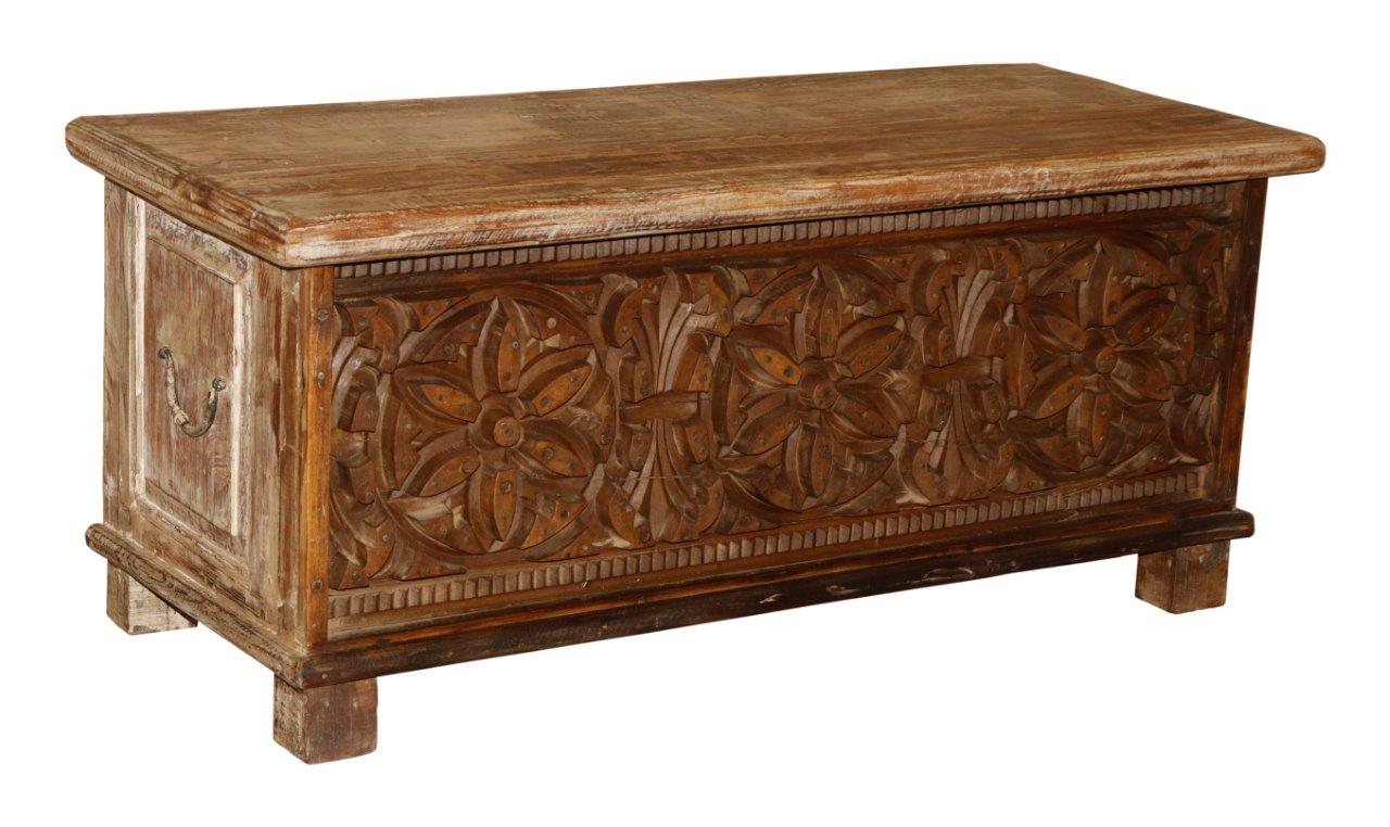 The facade of this chest is a masterpiece of artisan woodwork, showcasing a continuous, majestic deep-relief carving of interlocking floral medallions and sunburst motifs. The ornate front is bordered by a classic dentil-style trim, while the sides feature traditional hand-forged iron ring handles and subtle whitewash distressing. Resting on sturdy squared block feet, this reclaimed wood style trunk offers generous storage for linens or keepsakes while doubling as a stunning, conversation-starting coffee table.