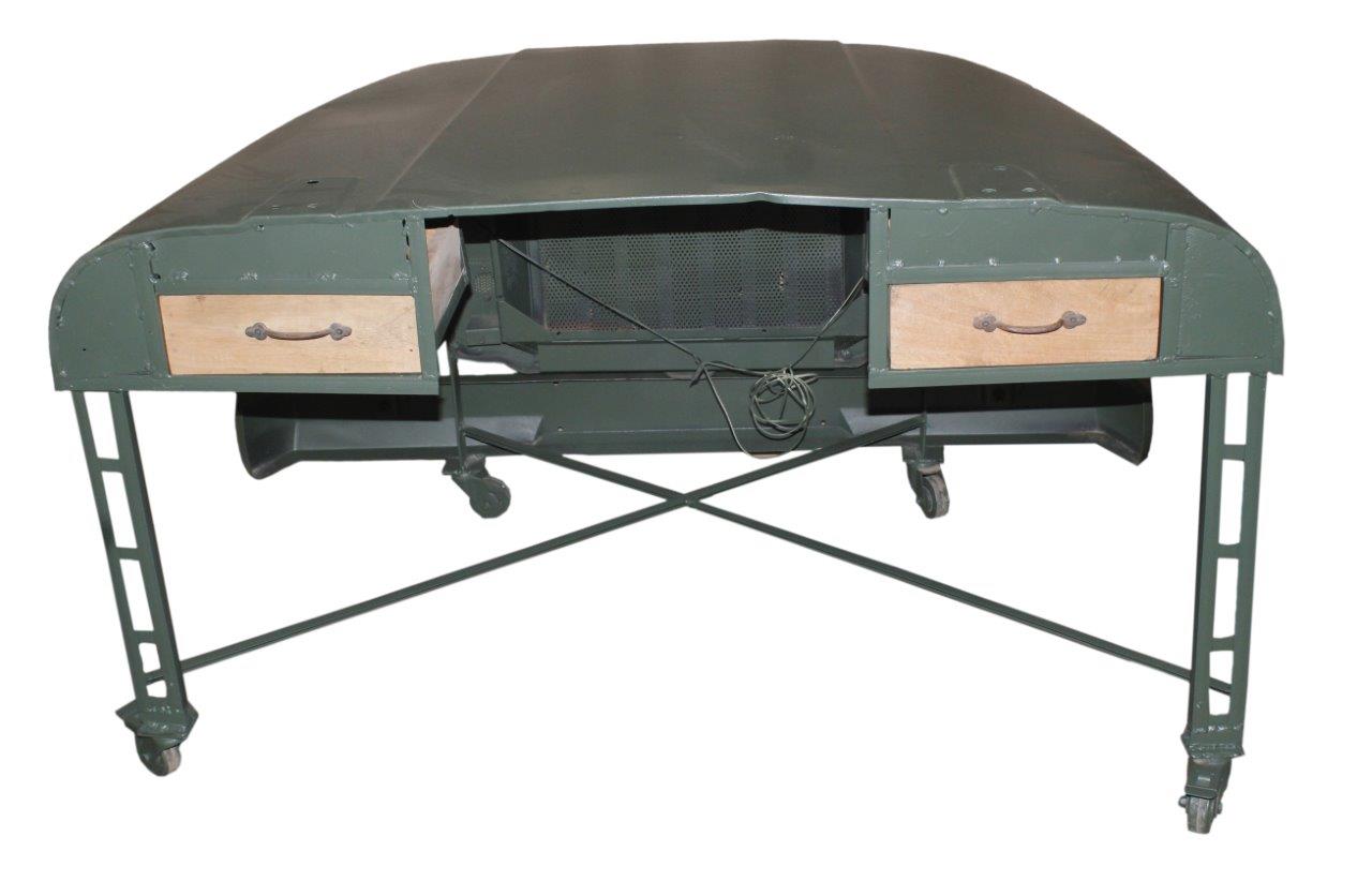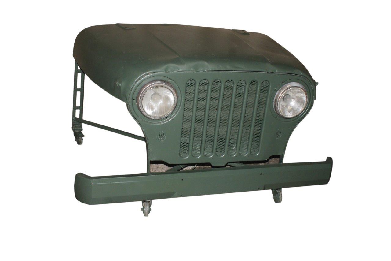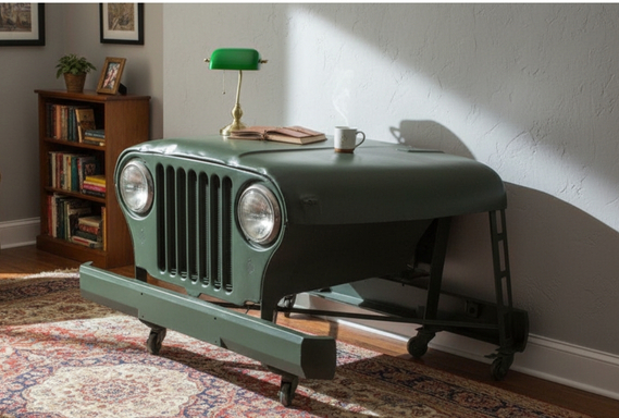 Bring a piece of automotive history and pure style into your space with this distinctive Vintage Jeep Desk/Console Table. Expertly crafted from the front grille and hood of a classic Jeep, this is more than furniture—it's a statement.