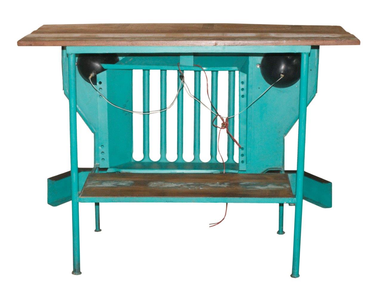 The base is finished in a majestic tri-color teal, white, and rust patina, providing a vibrant industrial foundation for the slim-profile solid wood top. The natural, weathered grain of the reclaimed wood surface offers a warm organic contrast to the cold-rolled steel of the vehicle facade. Perfect for a luxury man-cave, a boutique garage suite, or an eclectic industrial lounge, this artisan console includes a discreet lower solid wood shelf for glassware or collectibles.