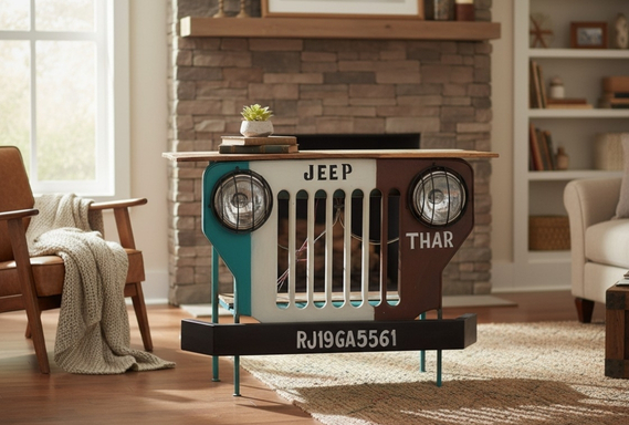 Ignite a sense of adventure in your home with the Vintage "Jeep Thar" Reclaimed Wood Bar Console. This premium conversational piece features an authentic, upcycled Jeep Thar front grill, complete with a rugged bumper, license plate detail, and functional-style round headlamps protected by wire cages.