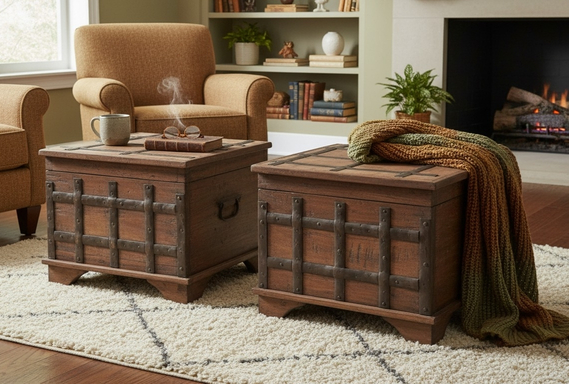 Anchor your room with the rugged, historical presence of the Vintage Reclaimed Wood Industrial Cross-Hatch Chests. This premium pair is handcrafted from substantial planks of solid wood, featuring a warm, natural finish that beautifully showcases the authentic grain and weathered character of the timber.